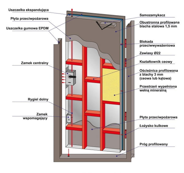 OPIS: Skrzydła z dwóch arkuszy blachy stalowej o grubości 1,5 mm, których kształt został nadany metodą gięcia na zimno. Te dwa elementy tworzą okładziny skrzydła drzwiowego. Konstrukcja została wzmocniona ceownikami, a przestrzeń pomiędzy profilami zapełniona wełną mineralną oraz dodatkowymi, przeciwpożarowymi płytami gipsowymi.