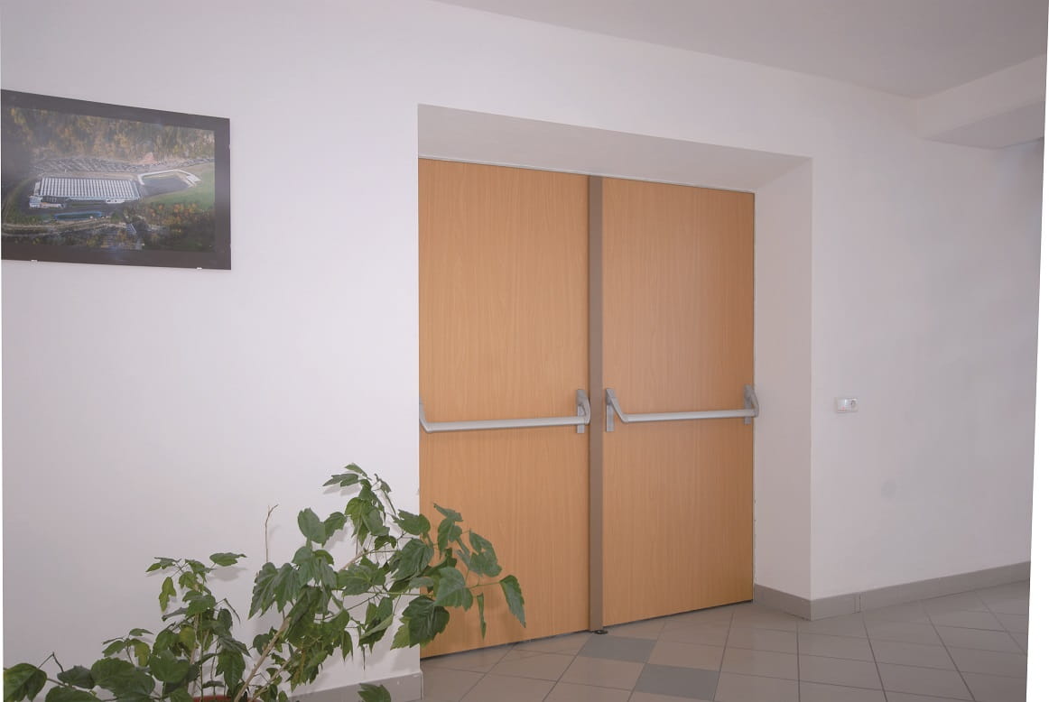 Drzwi wyposażone w okucia antypaniczne zapewniają bezpieczne i szybkie wydostanie się z pomieszczeń w razie niebezpieczeństwa.