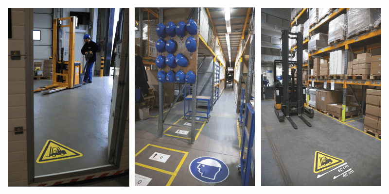 Znaki mogą wyznaczać ciągi komunikacyjne i ewakuacyjne w miejscach w których odbywa się ruch pieszy, samochodowy lub wózków widłowych.