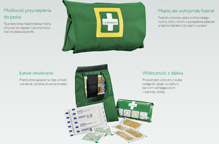 W apteczce podręcznej na każdym produkcie znajduje się jasna instrukcja użycia. Dzięki wyraźnym barwom ostrzegawczym – zielonej i żółtej – apteczka jest widoczna z dużej odległości.