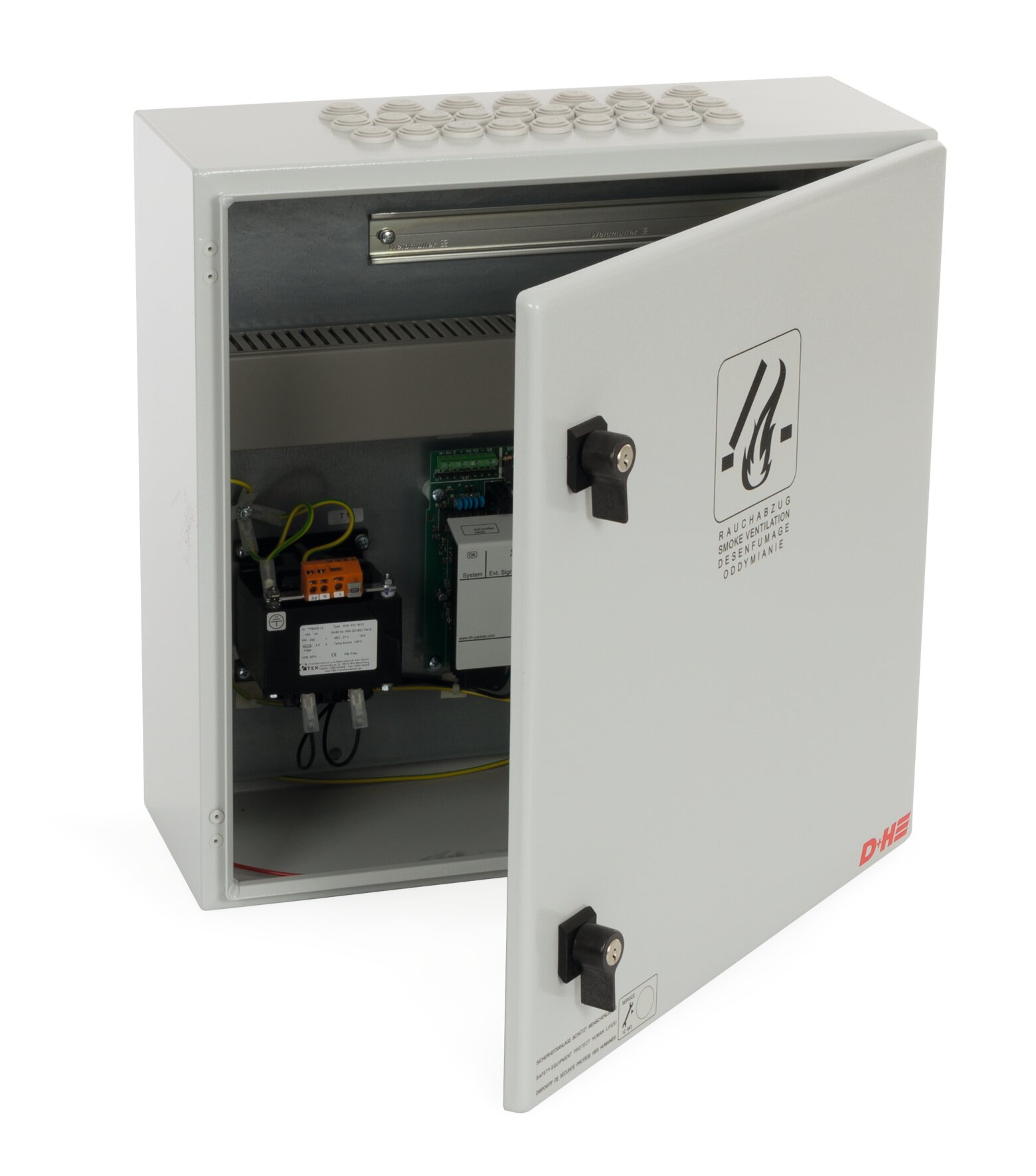 Modułowa centrala oddymiania 16 A w stalowej obudowie, sterująca systemami oddymiania i naturalnej wentylacji.