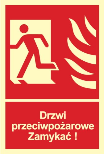 Znak "Drzwi ppoż. Zamykać! Kierunek drogi ewakuacyjnej w lewo" do oznaczenia miejsca niezmiernie ważnego podczas akcji gaśniczej.