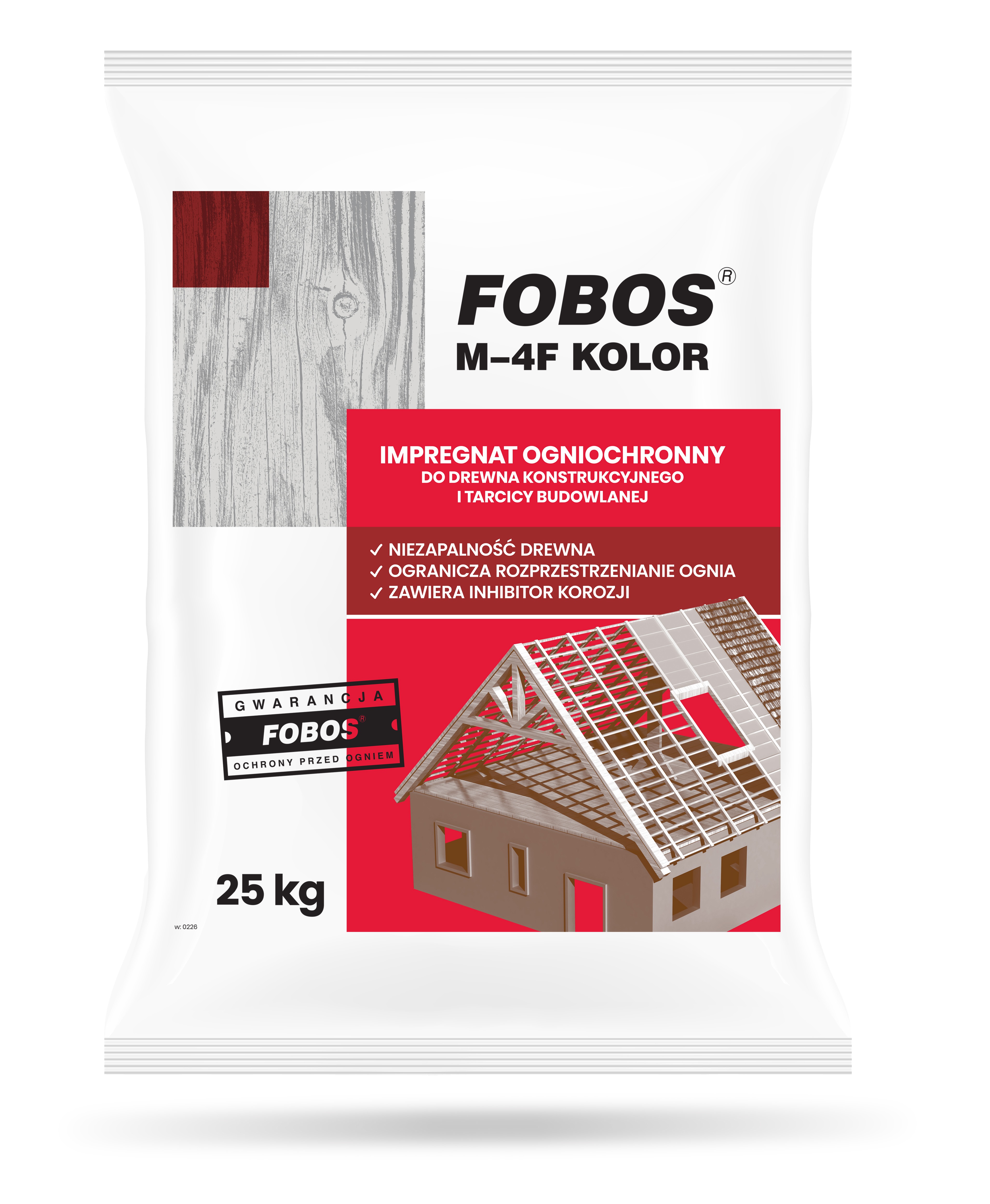 FOBOS M-4F to podstawowy, techniczny impregnat przeznaczony do ogniochronnego zabezpieczania drewnianych konstrukcji. Ogranicza udział drewnianych elementów w rozwoju pożaru skutecznie minimalizując rozprzestrzenianie się ognia. Przeznaczony jest do ogniochronnego zabezpieczania drewnianych elementów konstrukcyjnych znajdujących się wewnątrz budynków. W szczególności służy do zabezpieczania więźby dachowej, drewnianych konstrukcji, szkieletów czy legarów.