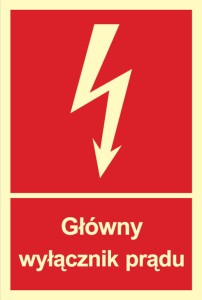 Znak "Główny wyłącznik prądu" do oznaczenia miejsca niezmiernie ważnego podczas akcji gaśniczej.