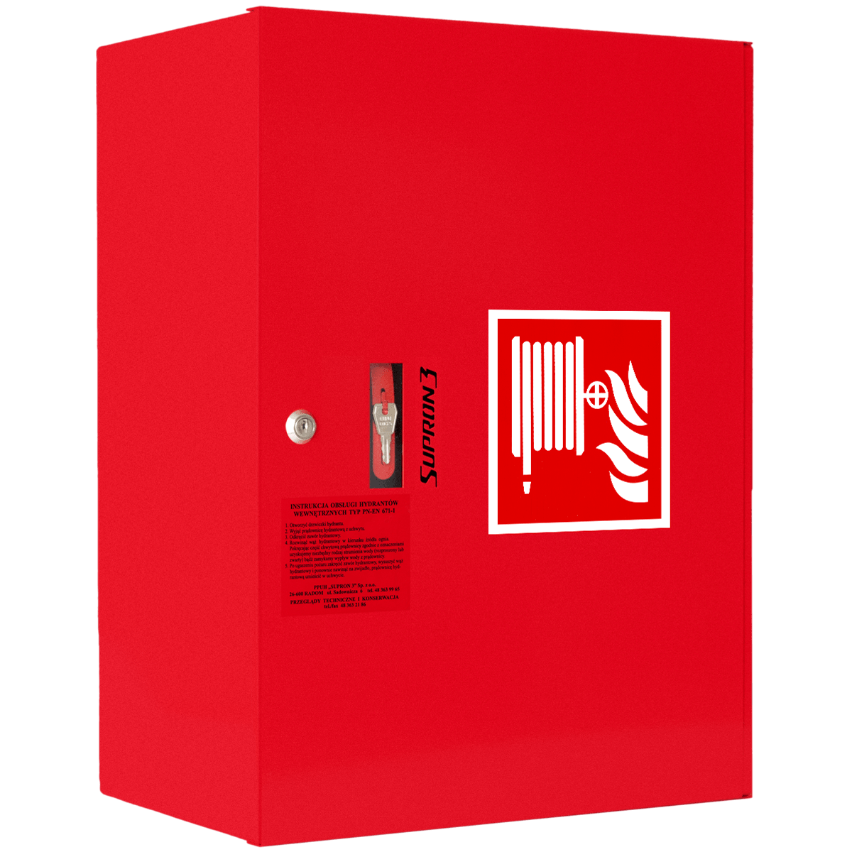 Hydrant to urządzenie, które umożliwia bezpośredni pobór wody z głównych przewodów sieci wodociągowej. Korpus szafki wykonany jest blachy stalowej ocynkowanej zaginanej ze wszystkich stron; połączenia zgrzewane i spawane. Szafa malowana jest farbą proszkową epoksydowo-poliestrową w kolorze czerwonym RAL3000 lub białym RAL9010 jako standard. Każda szafa hydrantowa zamykana jest na zamek Patent, który jest wpuszczanym zamkiem cylindrycznym wyposażonym w dwa kluczyki. Na płycie drzwiowej za hartowaną szybką szklaną o grubości 1 mm znajduje się jeden z kluczyków (zapasowy). Zastosowana szybka spełnia wszelkie wymogi bezpieczeństwa.