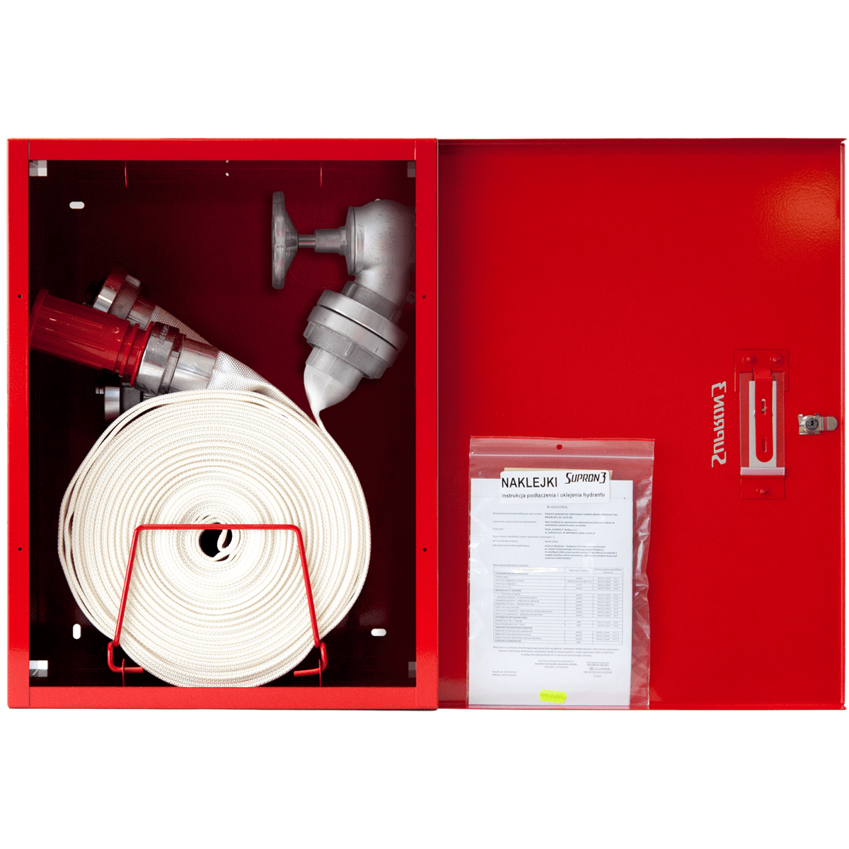 Na zewnętrznej stronie płyty drzwiowej szafki hydrantowej umieszczony jest znak bezpieczeństwa „Hydrant wewnętrzny” oraz numer certyfikatu zgodności. W górnej części wewnętrznej strony płyty drzwiowej umieszczona jest instrukcja obsługi hydrantu.