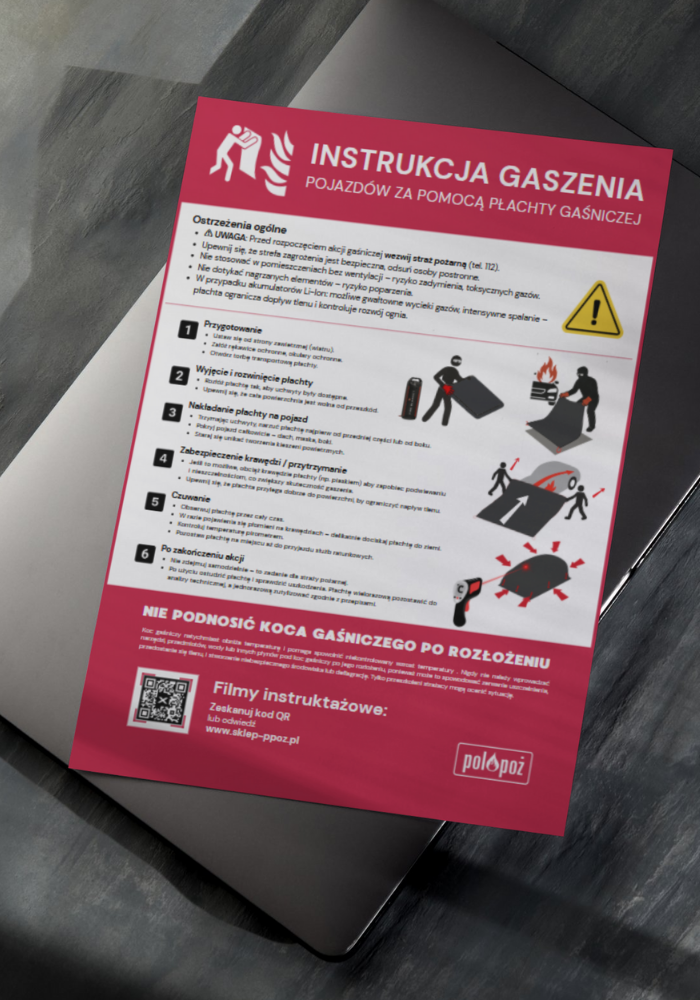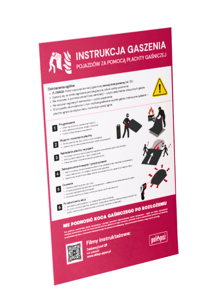 Idealna do oznakowania i uzupełnienia wyposażenia przeciwpożarowego – w szczególności zestawów z płachtą gaśniczą stosowaną przy pożarach pojazdów elektrycznych i spalinowych.