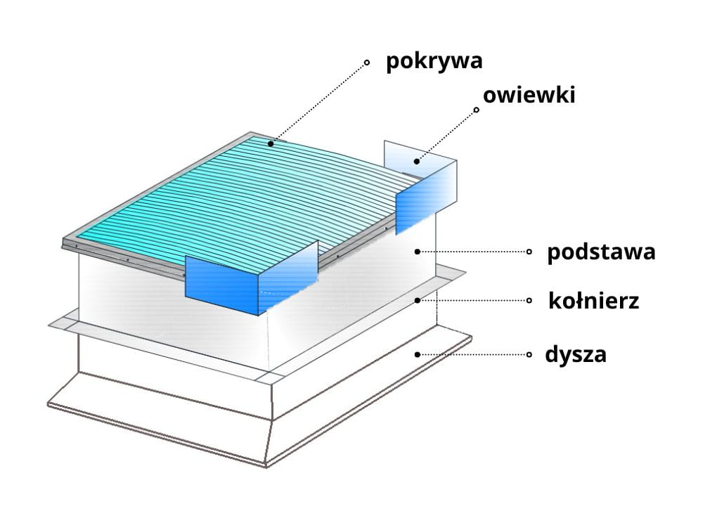 - Skrzydło klapy wykonane jest ze aluminiowych kształtowników. Wypełnienie skrzydła wykonane jest z komorowego poliwęglanu o grubości 16 mm lub 25 mm w kolorze mlecznym. Skrzydło zamocowane jest do podstawy za pomocą zawiasów, zazwyczaj na dłuższym boku. Na całym obwodzie znajduje się uszczelka, która zabezpiecza przez przedostaniem się wody do wewnątrz klapy.