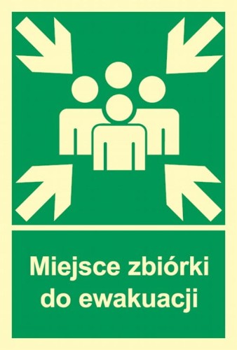 Znak: "Miejsce zbiórki do ewakuacji" służy oznakowaniu miejsca zbiórki do ewakuacji.