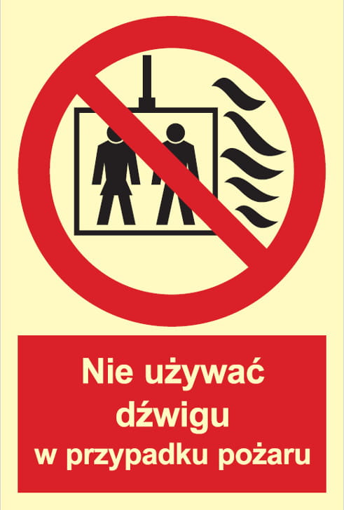 Znak "Nie używać dźwigu w przypadku pożaru" do oznaczenia miejsca niezmiernie ważnego podczas akcji gaśniczej.