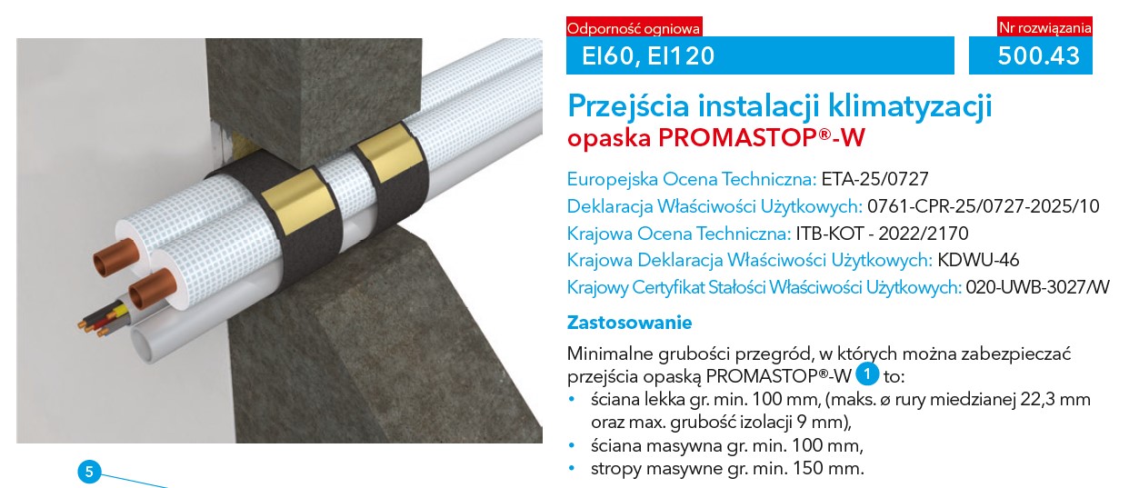 PROMASTOP®-W jest opracowanym na bazie specjalnej taśmy pęczniejącej systemem ogniochronnym stosowanym do uszczelniania przejść instalacyjnych. Zastosowanie PROMASTOP®-W pozwala na uzyskanie klasy odporności ogniowej w odniesieniu do konstrukcji stropów i ścian, w których znajdują się otwory stanowiące przejścia instalacyjne dla różnego rodzaju instalacji. Opaska PROMASTOP-W występuje w jednej grubości (2,5 mm) i dostarczana jest jako gotowa do użycia taśma w postaci rolki. Ilość warstw opaski zależy od rodzaju instalacji, konfiguracji zakończenia rury i jej średnicy oraz zastosowanej izolacji.