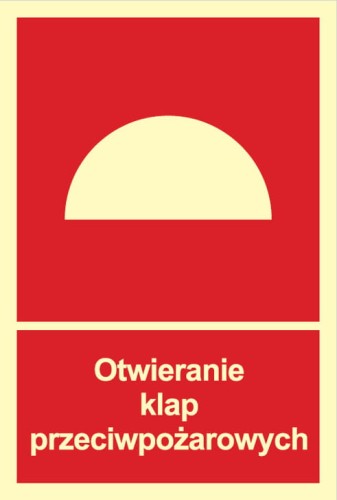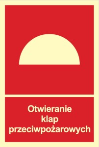 Znak "Otwieranie klap przeciwpożarowych" do oznaczenia miejsca niezmiernie ważnego podczas akcji gaśniczej.