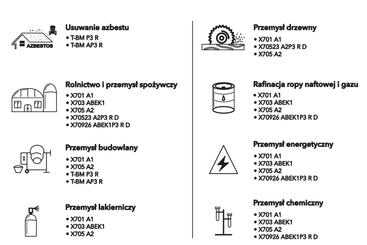 Pochłaniacz X703 ABEK1 jest produktem wielokrotnego użytku do półmasek i masek dwufiltrowych. Pochłaniacz X703 ABEK1 ze złączem bagnetowym, chroni przed organicznymi parami i gazami, o temperaturze wrzenia powyżej 65°C (kolor brązowy), nieorganicznymi parami i gazami, z wyjątkiem tlenku węgla (kolor szary), dwutlenkiem siarki oraz parami i gazami kwaśnymi (kolor żółty), amoniakiem oraz pochodnymi amoniaku (kolor zielony) przy stężeniu objętościowym w powietrzu nie przekraczającym 0,1%. Konstrukcja odchylna do tyłu zapewnia lepsze pole widzenia. Pochłaniacz X703 ABEK1 posiada złącze bagnetowe pozwalające na łączenie z półmaskami serii X6 i X7 oraz maskami pełnotwarzowymi serii X8.