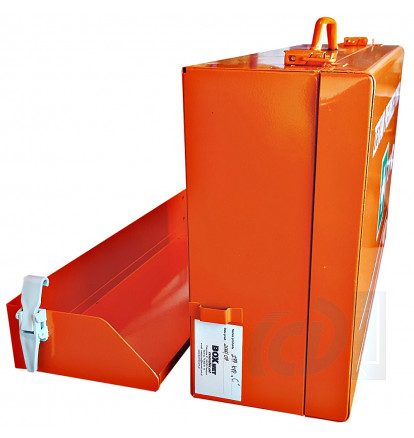 Zestaw umieszczony w metalowej walizce z możliwością zawieszenia na ścianie lub umieszczenia w punkcie medycznym, oznakowany zielonym krzyżem. Szafka występuje w kolorze pomarańczowym.