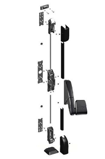 Zestaw ryglowania 2-punktowego przeznaczony jest do elektrycznego odryglowywania skrzydła biernego drzwi napowietrzających. W skład zestawu wchodzi zestaw okuć do montażu nawierzchniowego na skrzydle biernym drzwi napowietrzających oraz napęd liniowy VH-2 wyposażony w wyłącznik przeciążęniowy sterowany centralą oddymiania AFG.