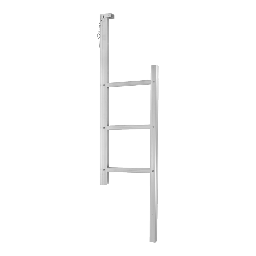 Po wyciągnięciu zatyczki na szczycie drabina rozkłada się. Stopnie blokują się w pozycji prostopadłej między profilami bocznymi i drabina jest gotowa do użycia.
