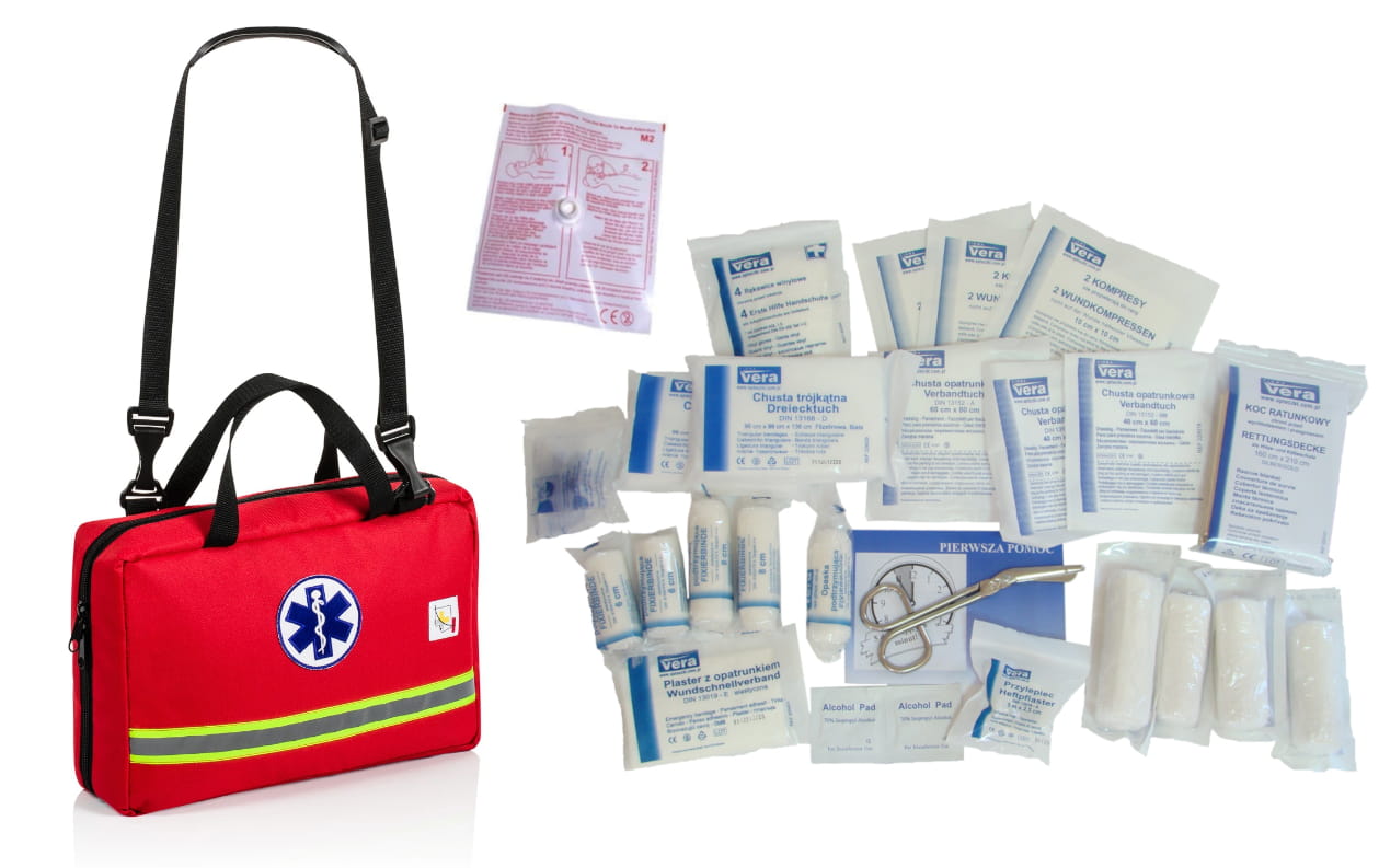 Skład wyposażenia spełnia wszystkie wymagania normy DIN 13164. Całość zapakowana jest w woreczek foliowy. Wyposażenie należy rozmieścić w torbie wg własnych upodobań.