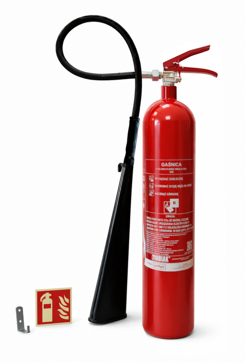 ZESTAW: Gaśnica śniegowa 5 kg CO2 89B typ GS5x Exclusive Mobiak z wieszakiem i znakiem GAŚNICA 15x15cm
