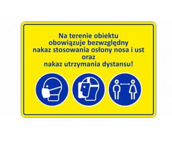 Tabliczka informacyjna dotyczące nakazów i zaleceń odnośnie zagrożeń związanych z COVID-19.