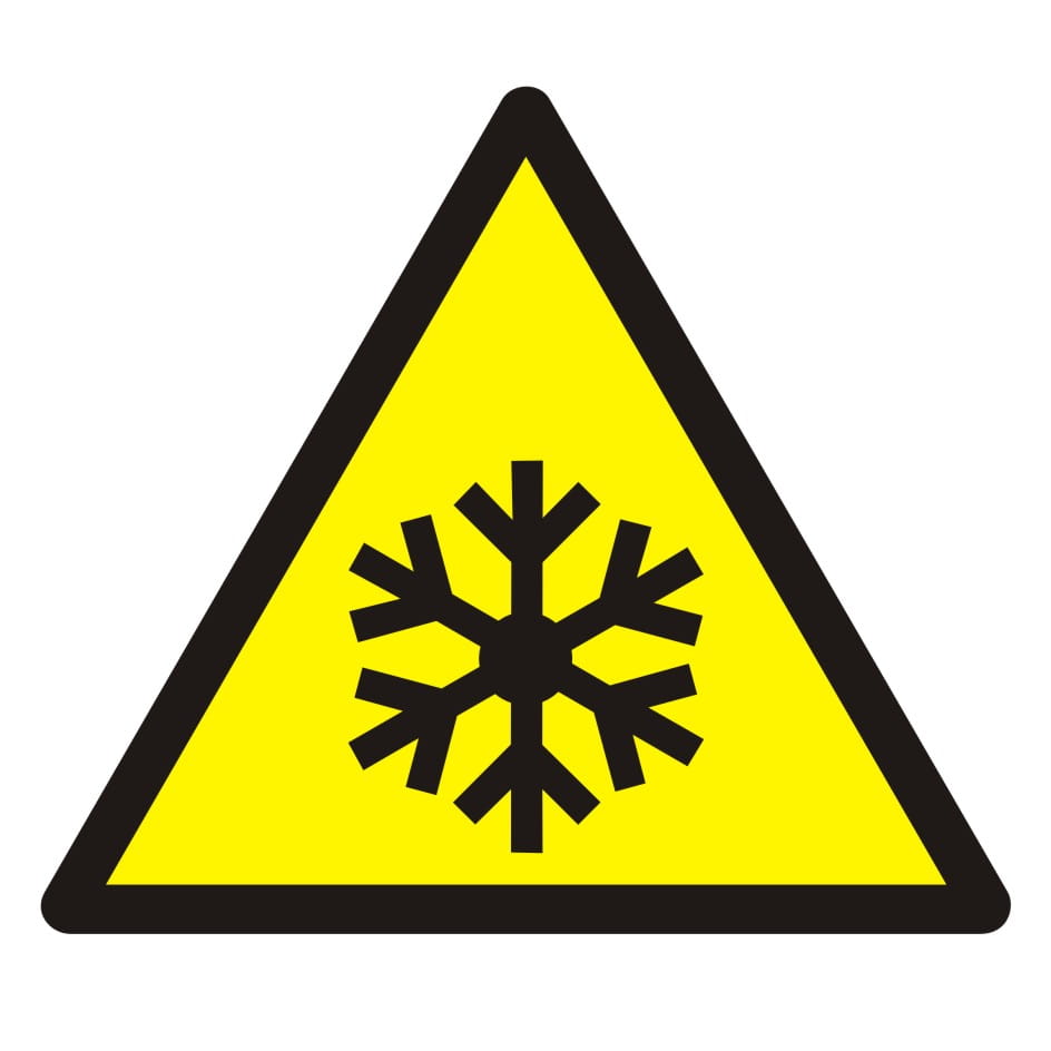 Znak stosowany w celu ostrzeżenia przed niską temperaturą. Znaki w formatach: F2 42 x 42 cm, H1 66 x 66 cm na podłożu p - wykonujemy na płycie sztywnej PCV o grubości 1,5 mm